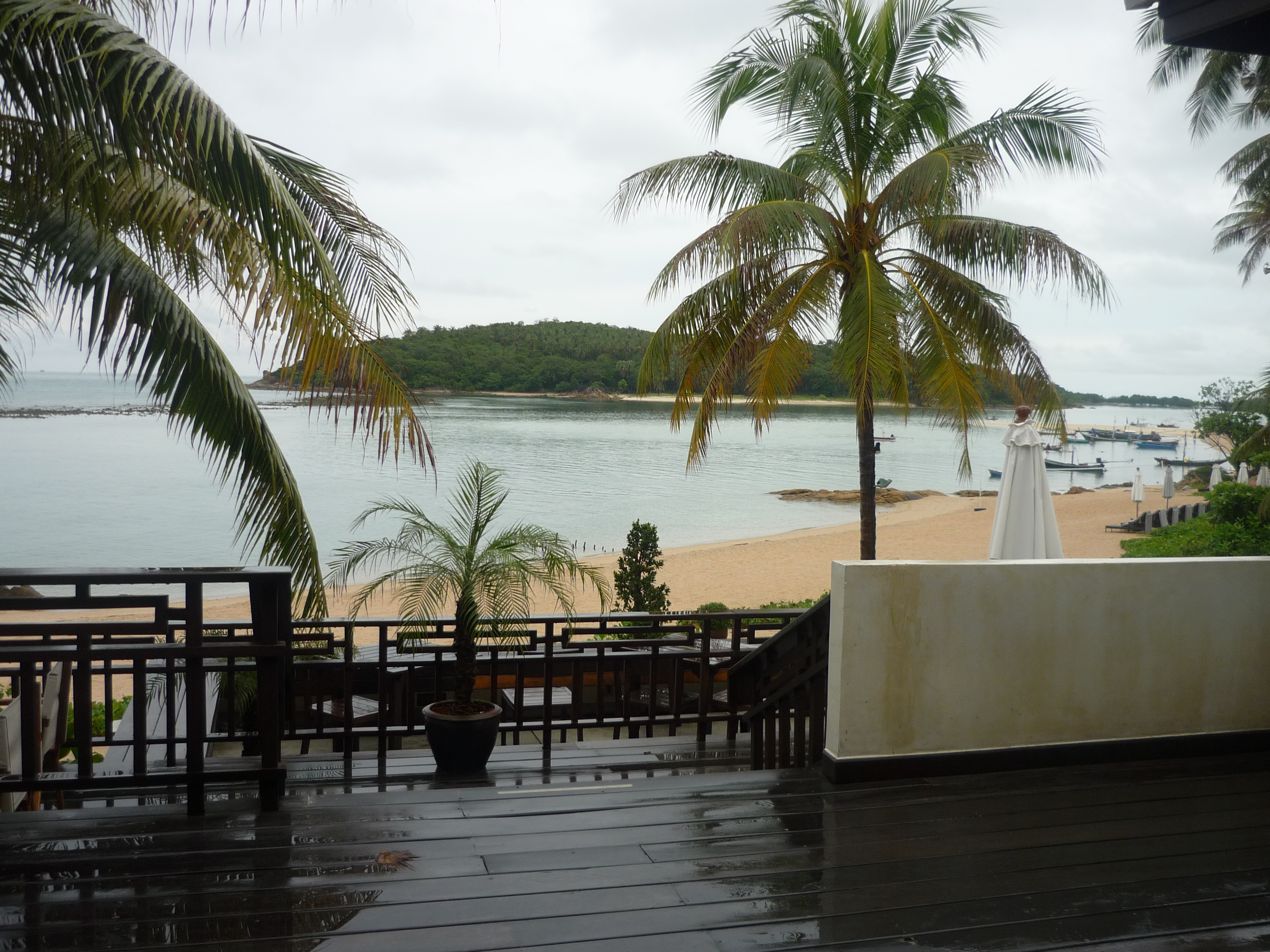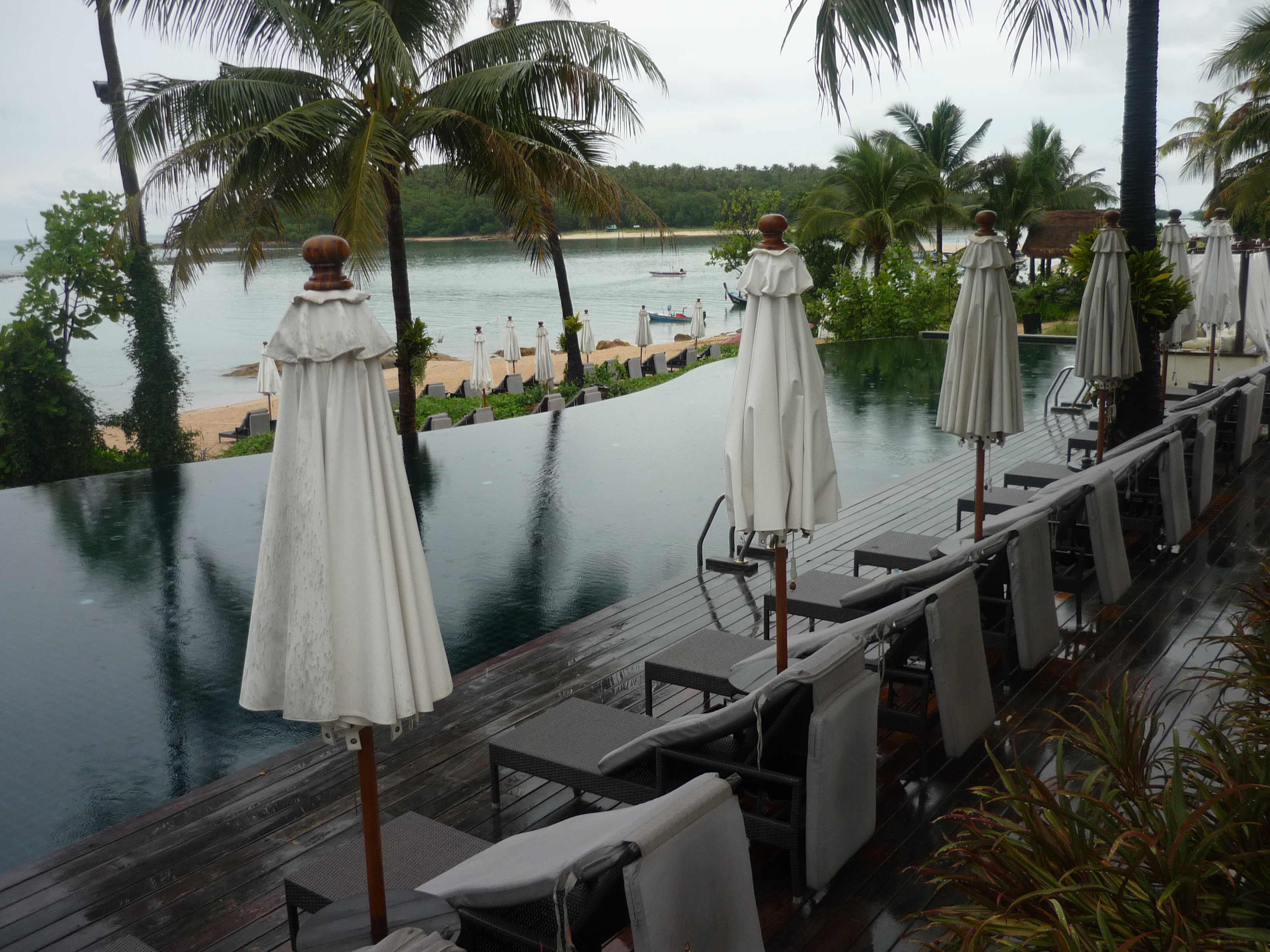 Uzun bir evlilik hazırlığı, ağır bir düğün yükü, uzunca bir uçak yolculuğundan sonra yeni güne uyandığıımda, uzunca süredir güne bu kadar huzurlu ve enerji dolu uyanmadığımı fark ettim, adayı gezeceğimiz ve gündüz gözüyle göreceklerimizin heycanı da az değildi 🙂 Kalkıp terasa çıktığımda cehenem sıcagında yağmurlu bir havayla karşılaşmış olmamıza rağmen moralimizi hiç bozmadan, kahvaltı etmek için otelin yemyeşil, ıssız ve sessiz patikalarından sahildeki restaurant’a doğru yol aldık. Otel dediğime bakmayın, resmen tropik ormanın içine yerleştirilmişl bir koy gibi, mesafeler birbirinden uzak, etraf çok sakin, adeta unutulmuş bir cennet gibi..Sahile indiğimizde karşımıza çıkan ilk manzara, dupduru dümdüz bir deniz, upuzun bembeyaz bir kumsal, ve komşu minik adaydı 🙂