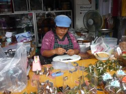 ve bence dönüşte sevdiklerimize hediye olarak getirebileceğimiz yegane şeyi bulduk, hindistan cevizi lokumu ya da macunu diyebiliriz! Hindistan cevizinin macun haline getirilip sonra da çeşitli kuru yemişlerle çeşnilendirildiği ufak atıştırmalıklar, bu bölgede karşımıza çıkan en şeker rastlantıydı. Çarşıda ayrıca hindistancevizi özüyle yapılmış sabun, losyon ve bambudan yapılmış kıyafetler çok revaçta, buranın fiyatları Chaweng çarşısındaki yerlerden bir gıdım daha yüksek, ama pazarlıkla farkı kapatmak mümkün.