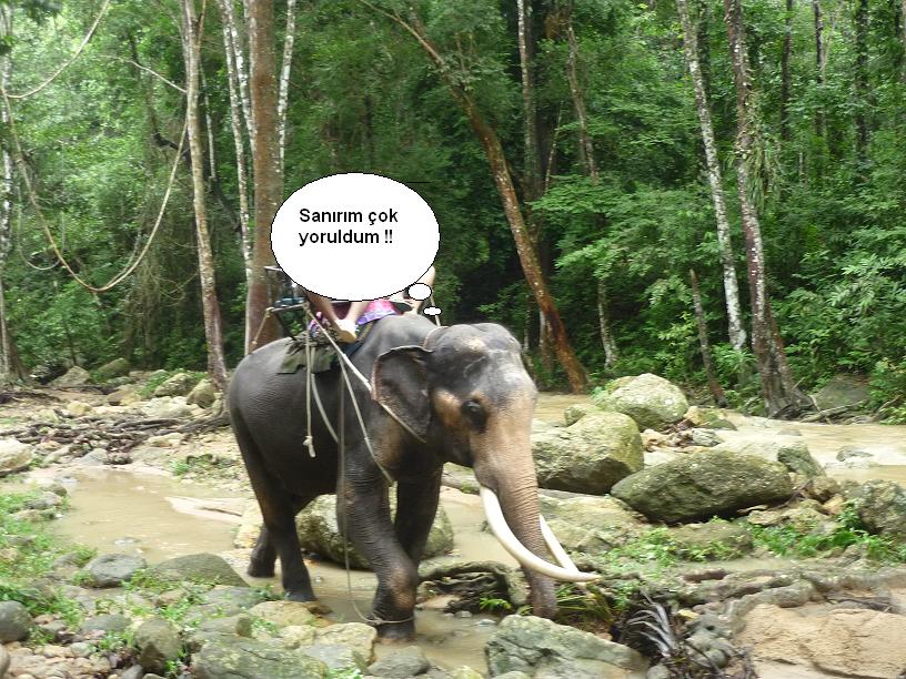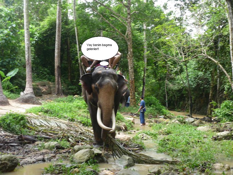 Şelaleyi gözlemledikten hemen sonra, rehberimiz bize ormanda fille dolaşmak istersek hemen ayarlayabileceğini söyledi. Emin olmamakla beraber eğlenceli gibi görünen bu fikir özellikle Pıtırcan’ı çok heycanlandırdığı için teklifi kabul ettik. Etmez olaydık! Sanırım hayatımda hiç bu kadar stress altında olmamıştım. Yerden o kadar yüksekte, o kadar dengesiz bir varlığın üzerindeydik ki, 30 dakika boyunca midem ve kalbim elimde dolandığımı itiraf etmeliyim. Tam bir Türk gibi içinde bulunduğum bu sevimsiz ve rahatsız ortama karşı sürekli küfür eden ve çığlıklar atan bana rağmen yerel “Elephant Rider” ile kahkahalar içinde sohpet eden sevgili Pıtırcan’ın ise keyfine diyecek yoktu, bir de şöförümüzün önce bir ağaca tırmanıp topladığı meyveleri bize vermesinin ardından, filin üzerinden inip onu başı boş bırakmasıyla bendeki adrenalin tavan yaptı, sanırım hayvanın üzerinden indiğimde tansiyonum 20’leri görmüştür. Yine de hayatta bir kez yaşanacak bir tecrübe olduğundan, Samui’ye giderseniz fil gezisi yapmadan dönmeyin derim.
