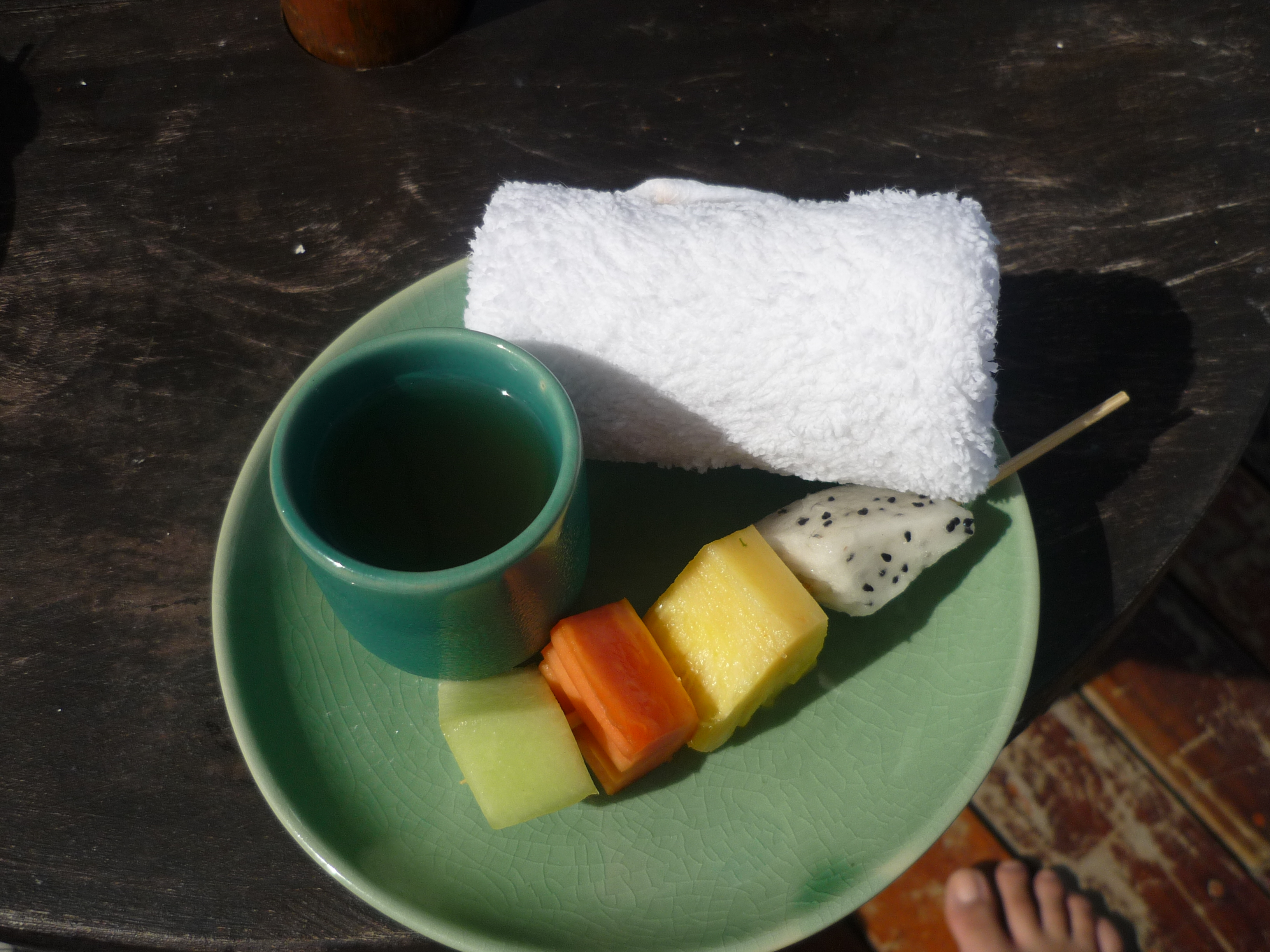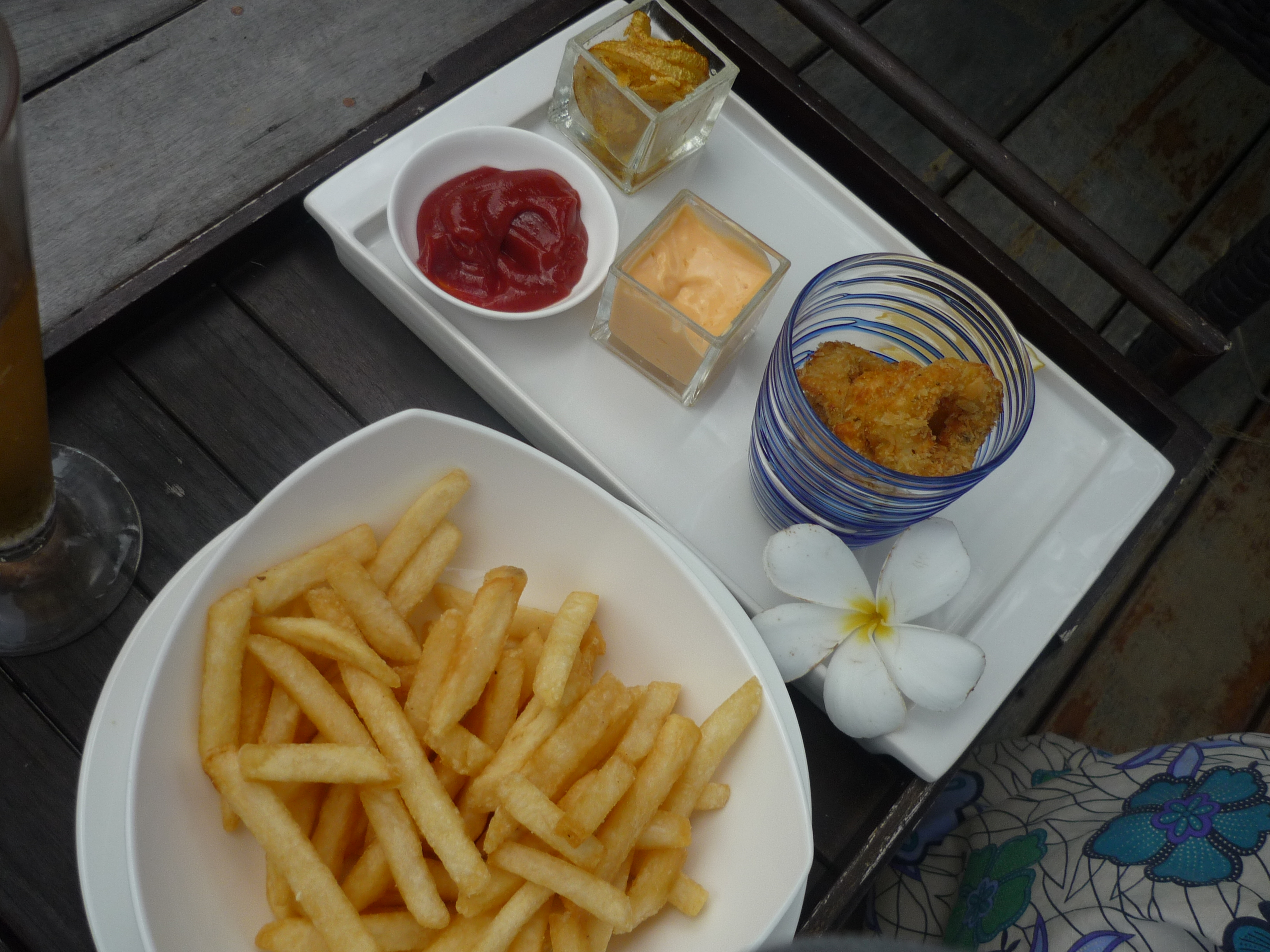 Deniz havuz derken güzel lezzetlerden uzak kaldığımızı sanmayın, adadaki en güzel kalamarları otelimizde yediğimi söylemek istiyorum, ayrıca yine gün içinde hem serinlemek hem de değişik tatları denemek adına seçtiğim hindistan cevizi kokteyli, ve gün içinde ferahlamak için ikram edilen meyveler ve zencefil çayı mükemmeldi:)