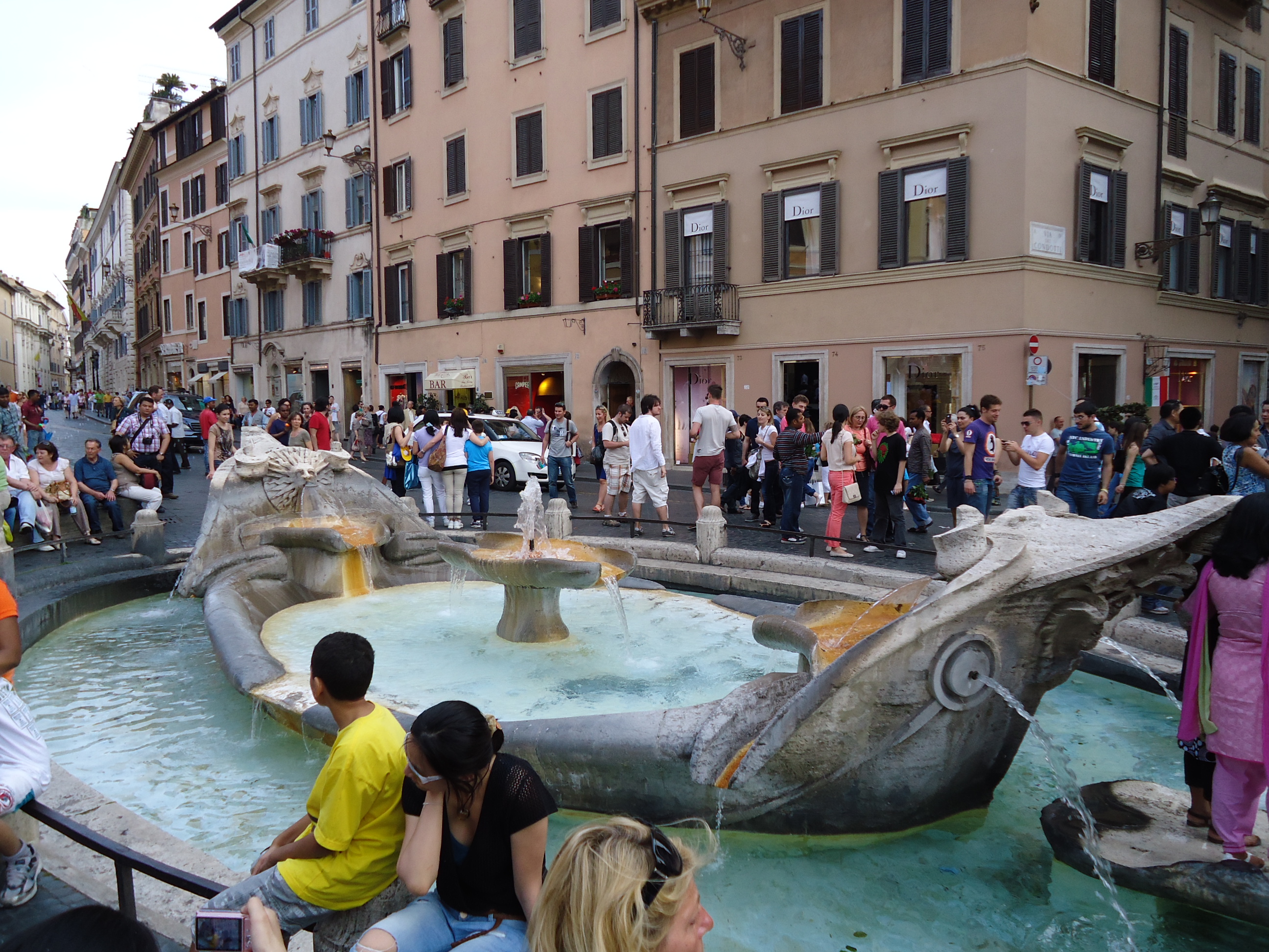 Roma’da her sokakta ilgi çekici başka bir dükkan veya mağaza görmek mümkün, benden tavsiye beğendiklerinizi mutlaka not alın çünkü benzerleriyle karıştırma durumunuz yüksek ve tabi aynı yeri bir daha bulamama riskinizde:) Etrafı hayranlıkla inceleyerek her detayı fotoğraflayarak dolaşmamıza rağmen ilk hedefimize ulaşmamız 30 dakikayı bulmamıştı. Sokaklarda oluşan insan kalabalığından, artan cafe ve hediyelik eşyacı sayısından çeşmenin yakınlarına geldiğimizi anlamak zor olmadı. Anlamakta zorlandığımız tek şey bu heybetli ve inanılmaz güzellikteki tarihi yapının bu küçük sokakların arasına nasıl yapıldığı ve bugüne kadar nasıl korunduğuydu.